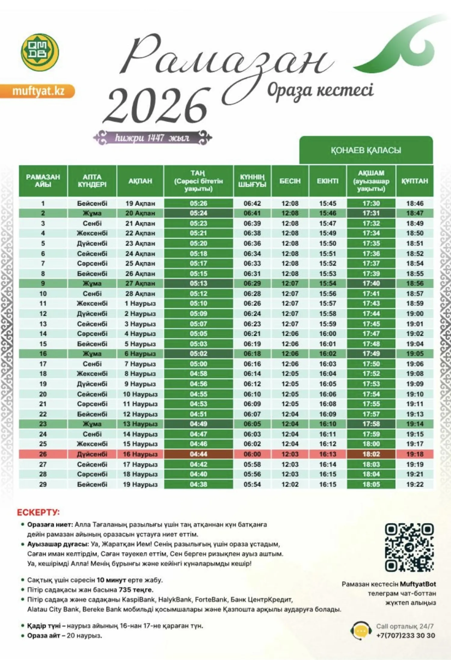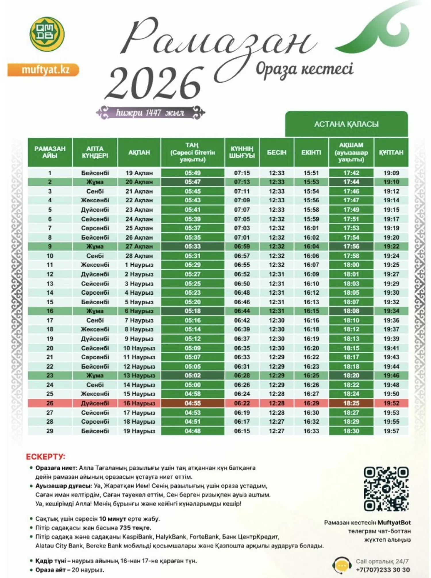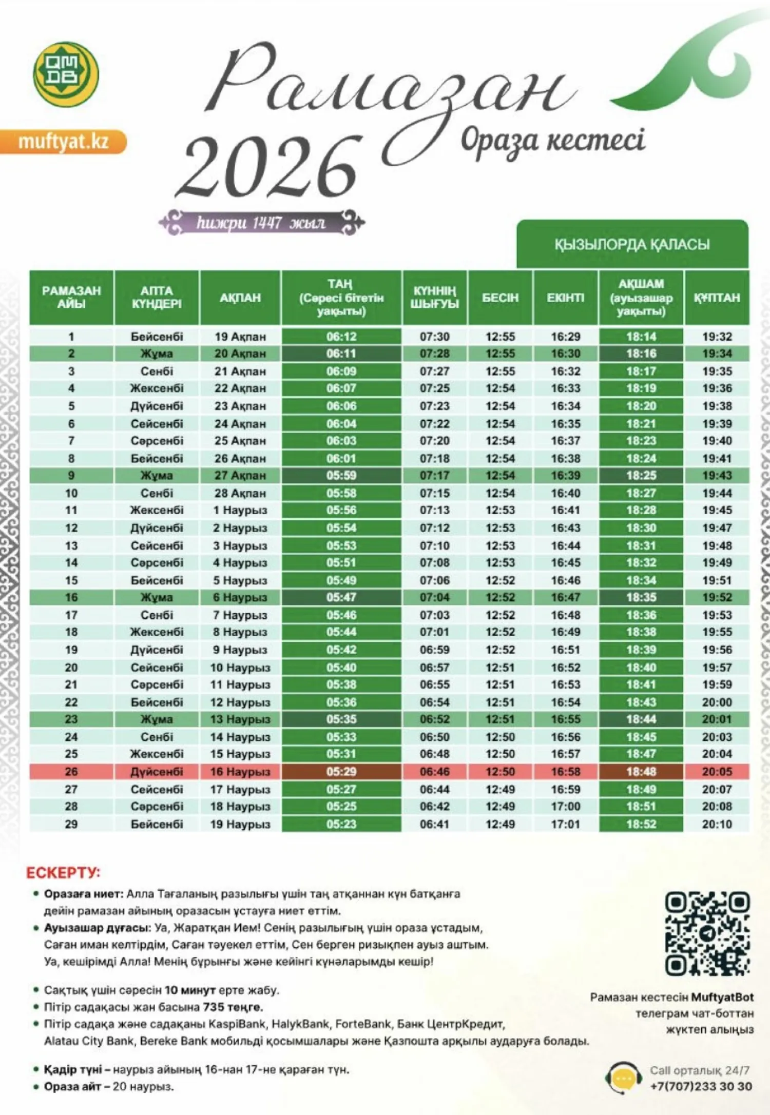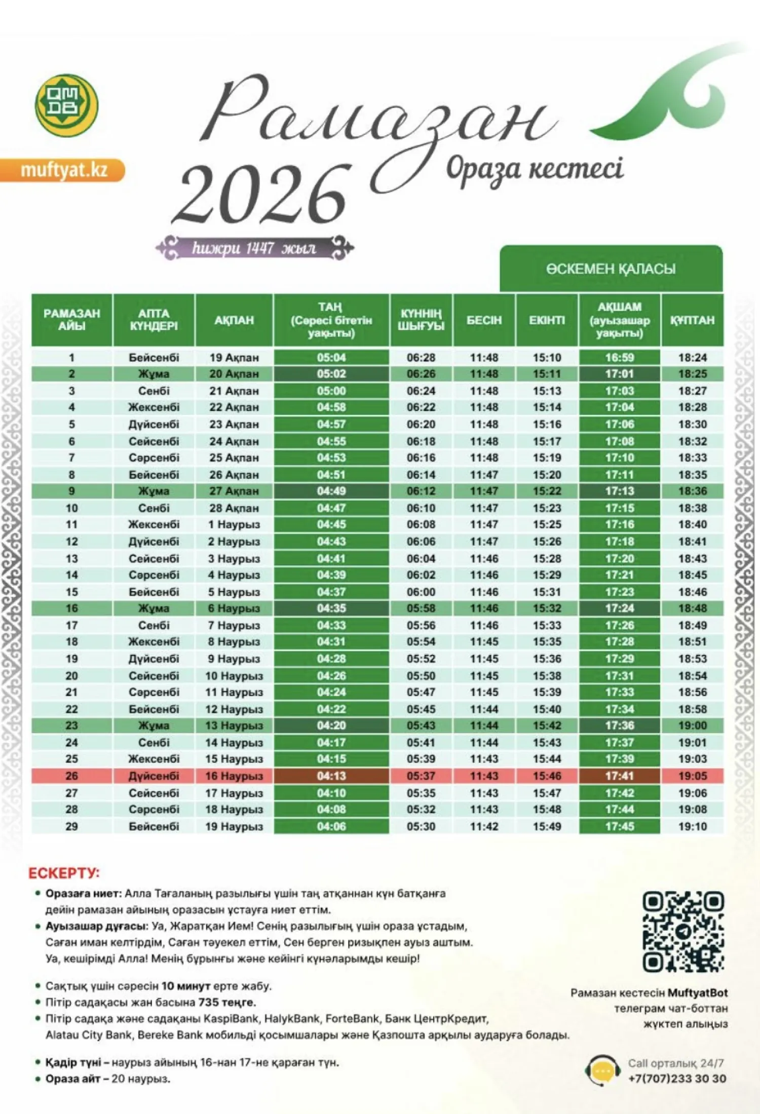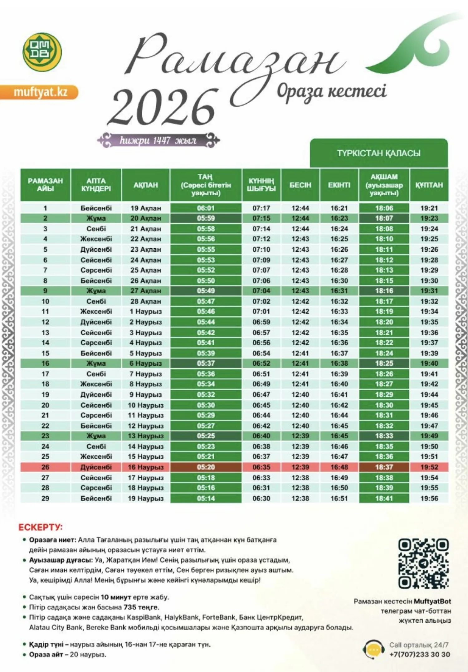 Қазақстан мұсылмандары діни басқармасы бекіткен Рамазан айының кестесін назарға ұсынамыз,- деп хабарлайды turkistan.today