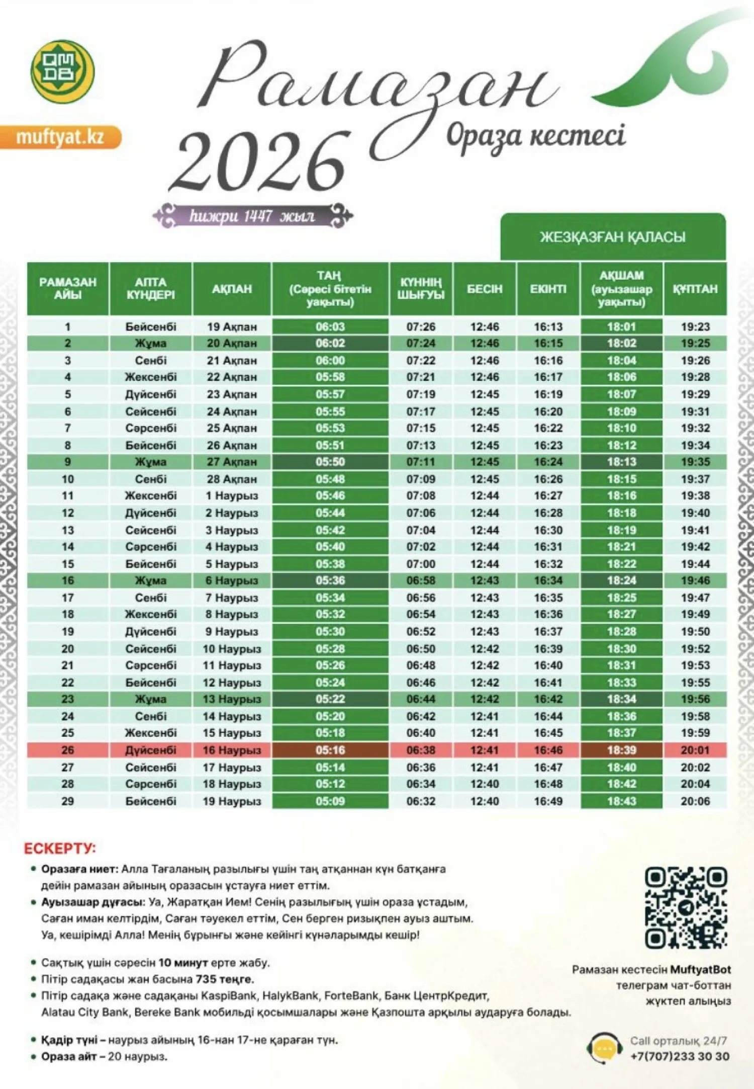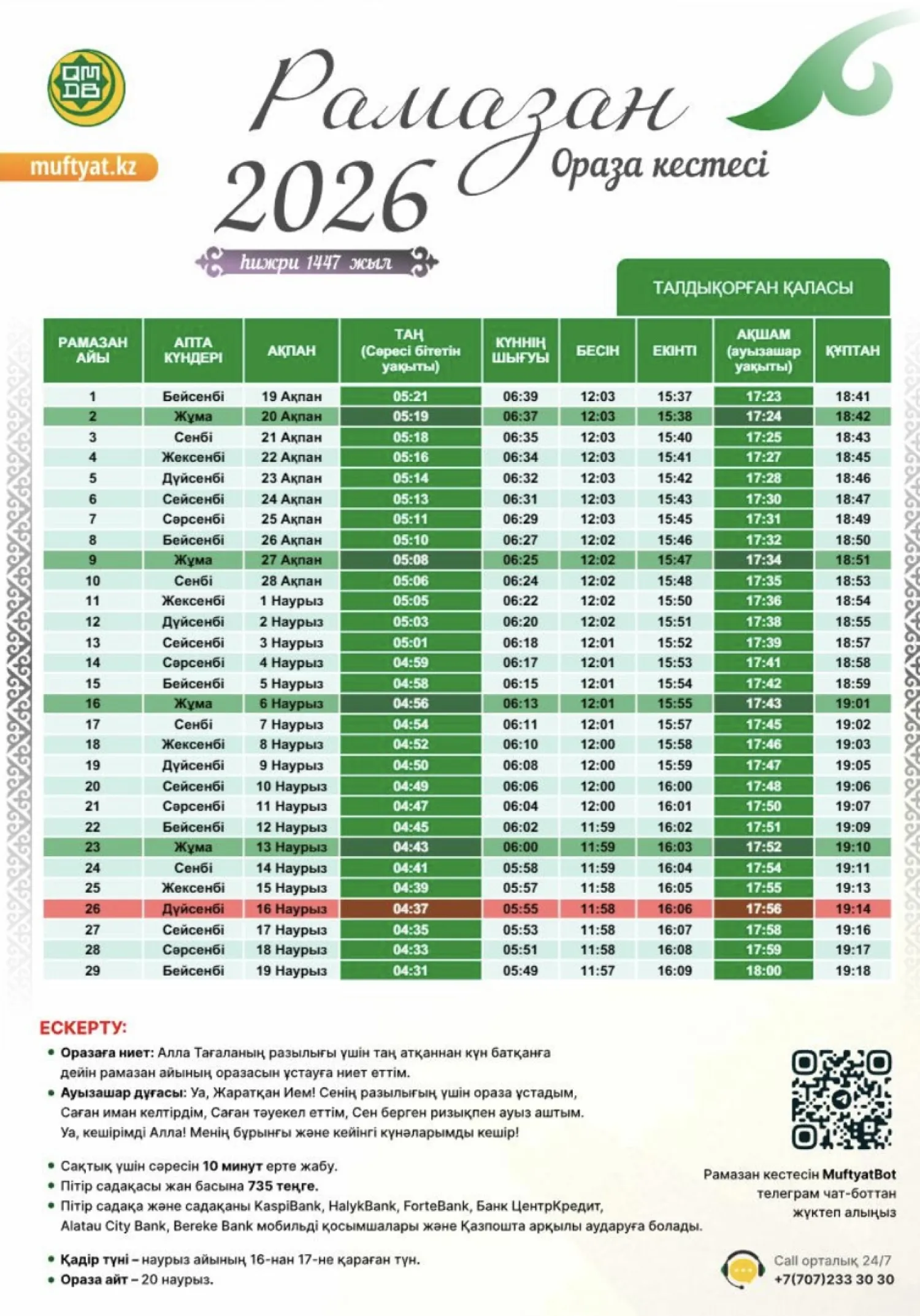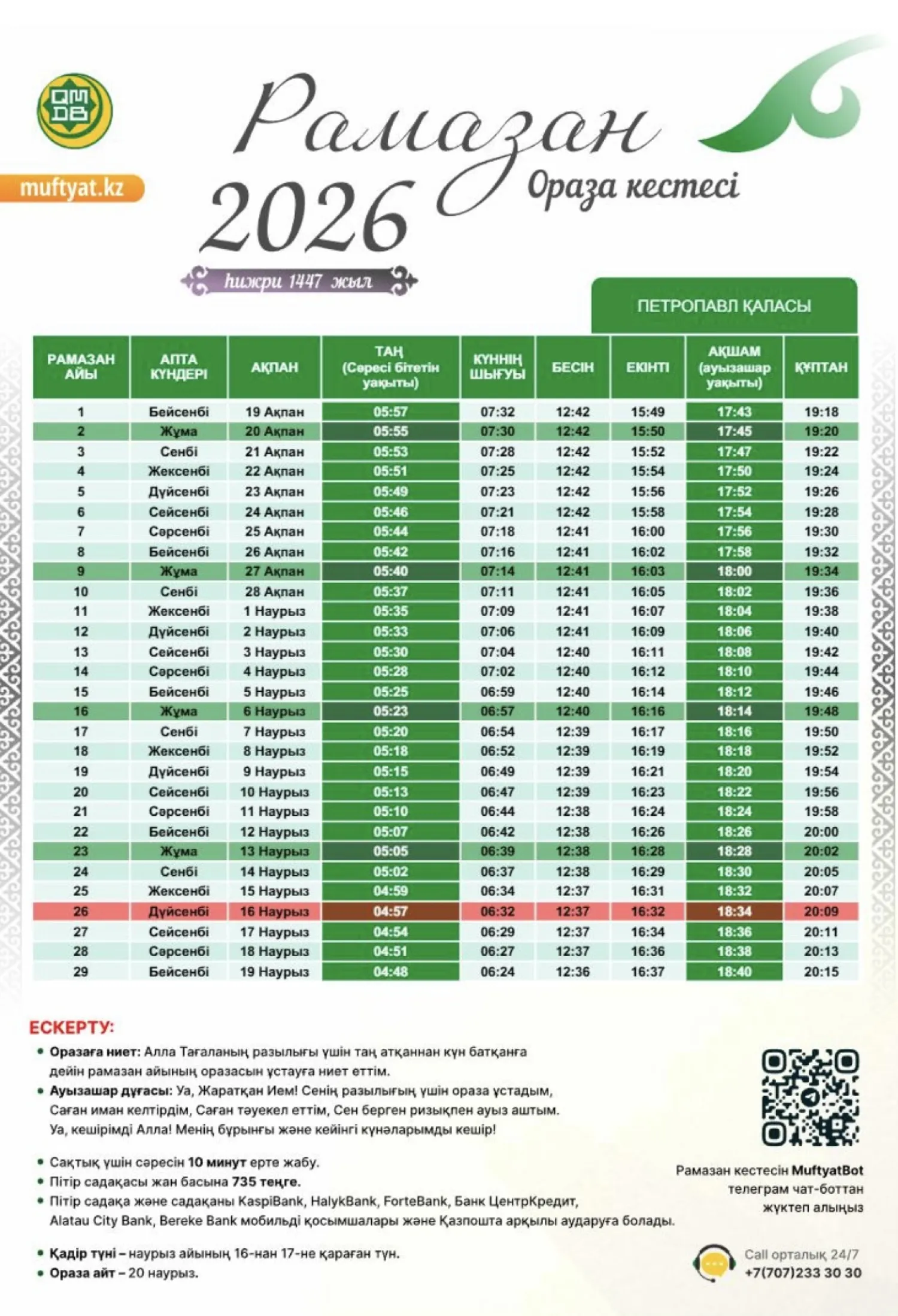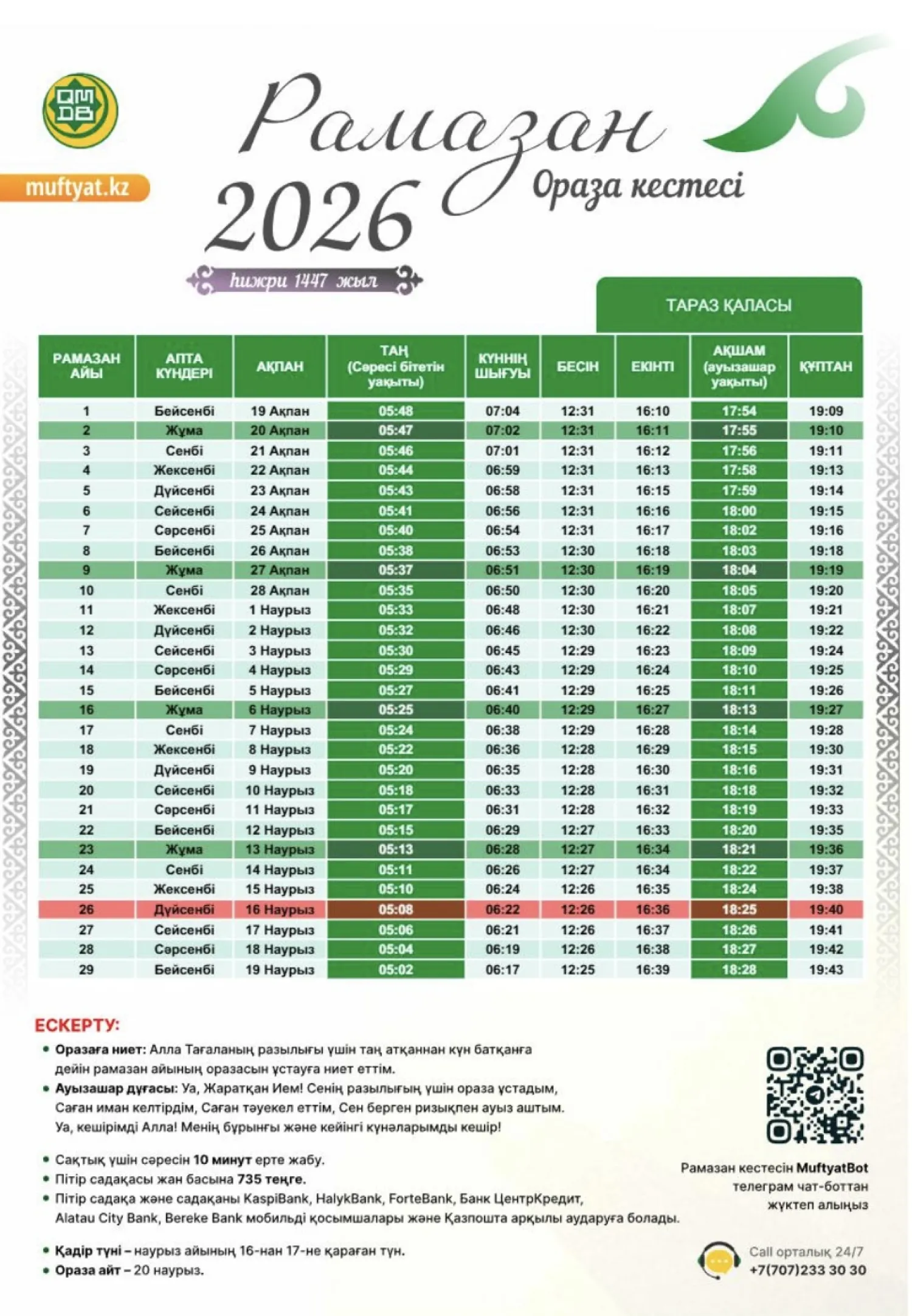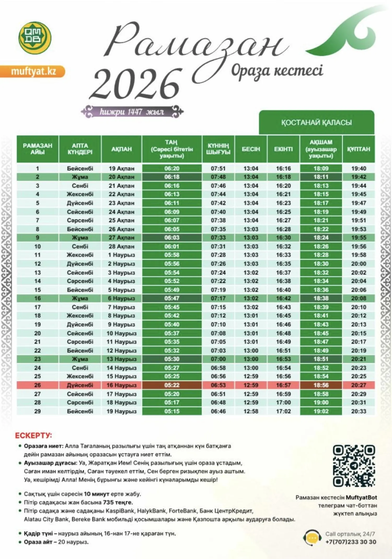 Қазақстан мұсылмандары діни басқармасы бекіткен Рамазан айының кестесін назарға ұсынамыз,- деп хабарлайды turkistan.today