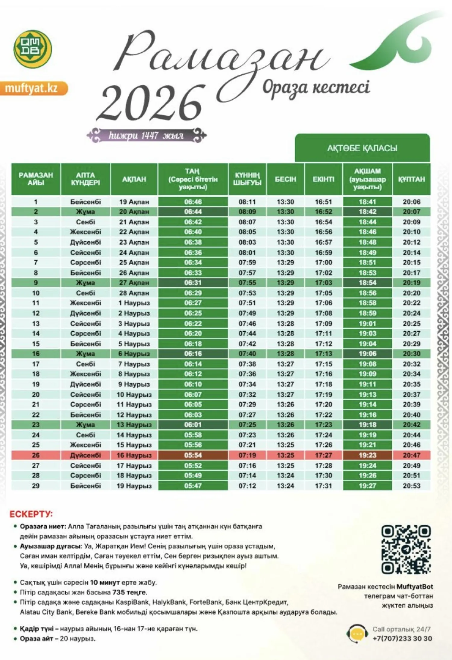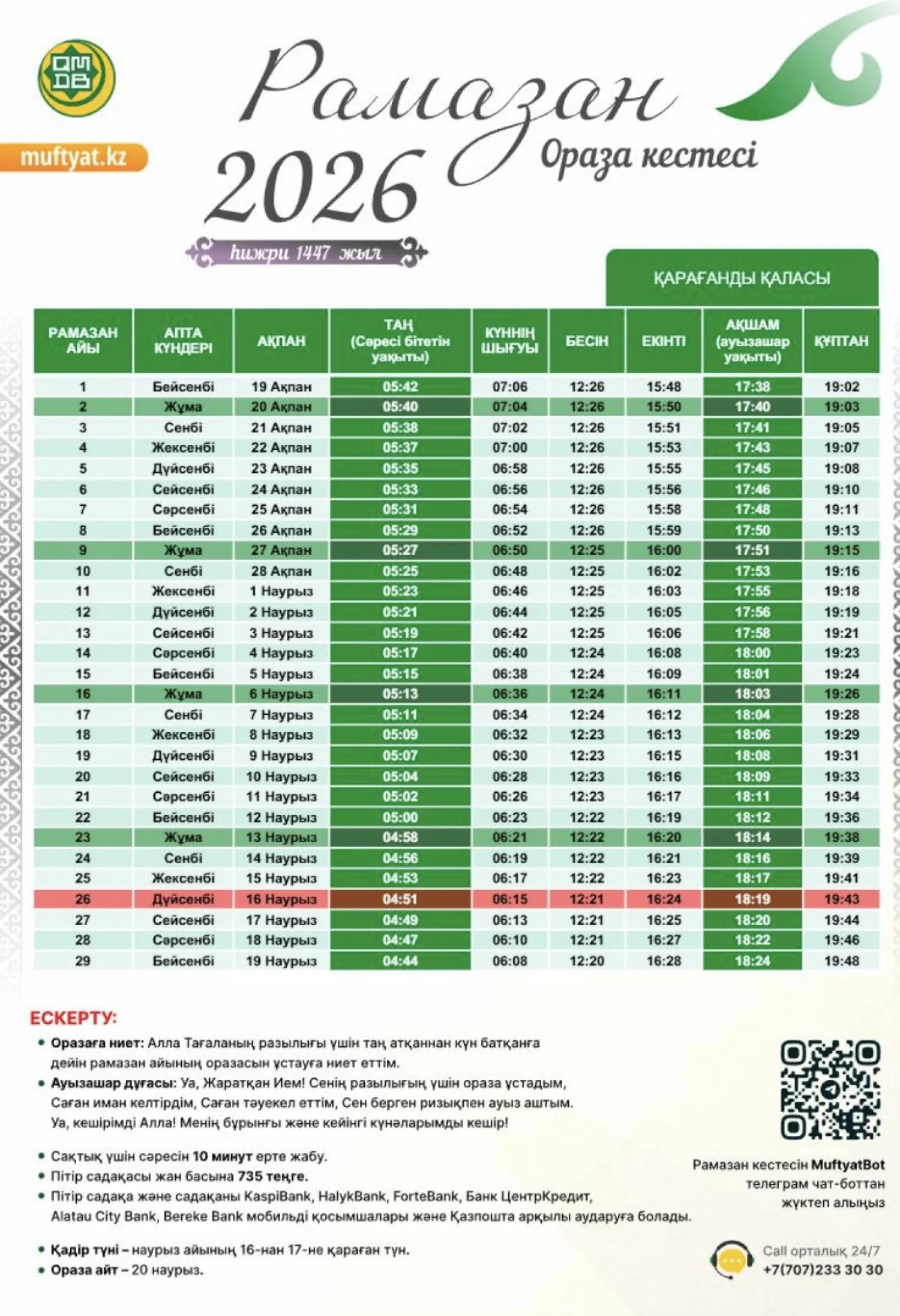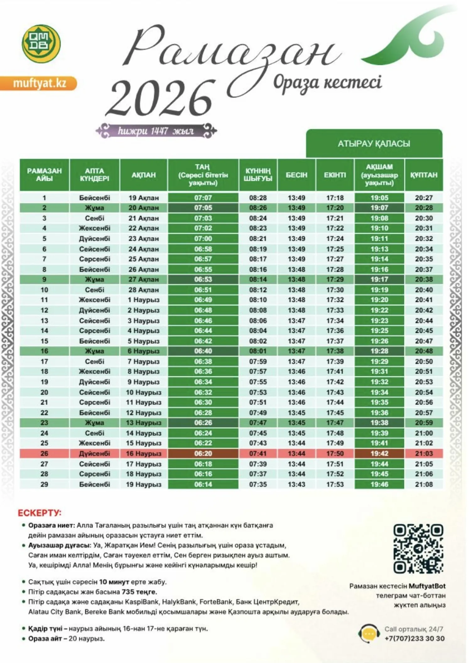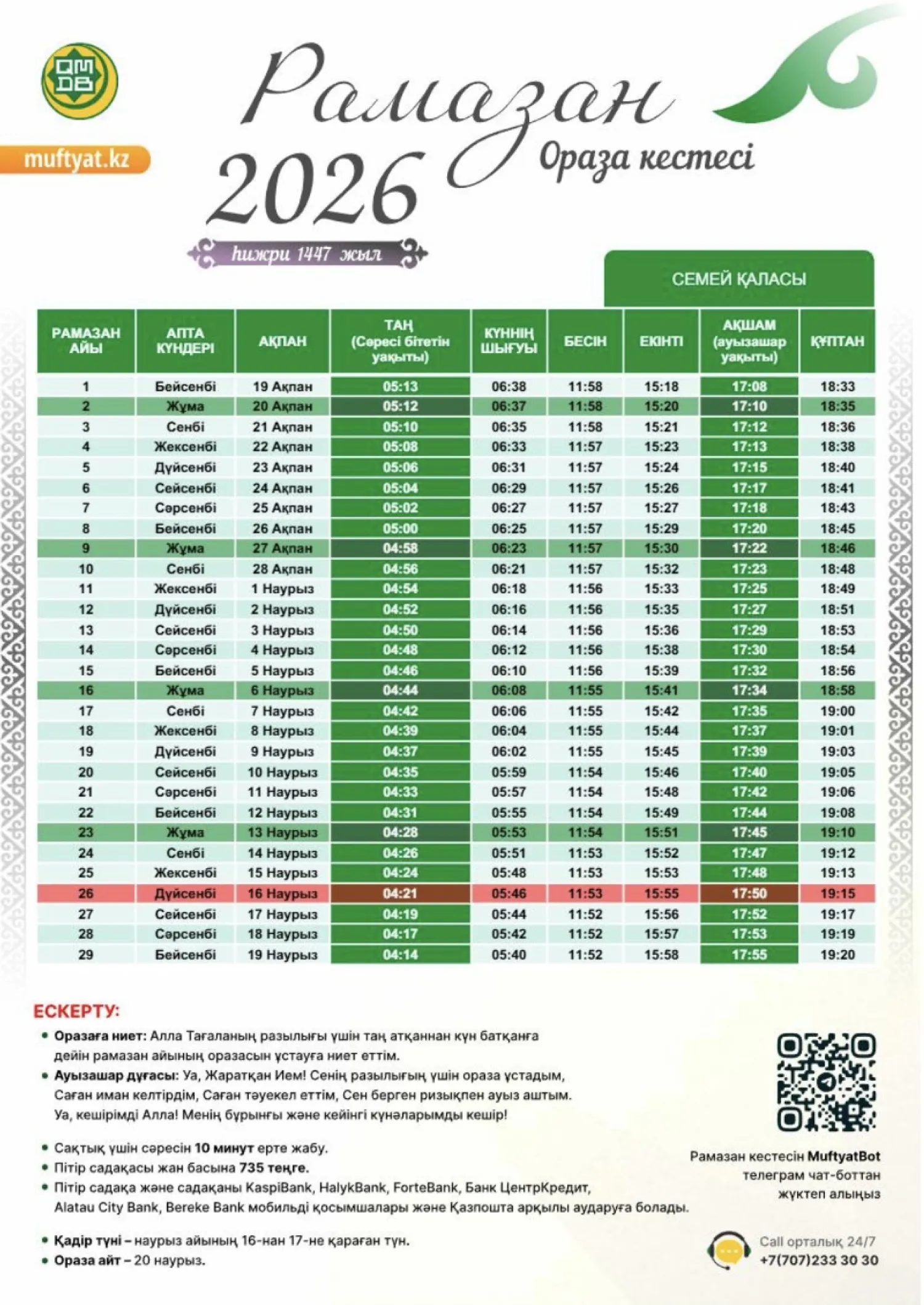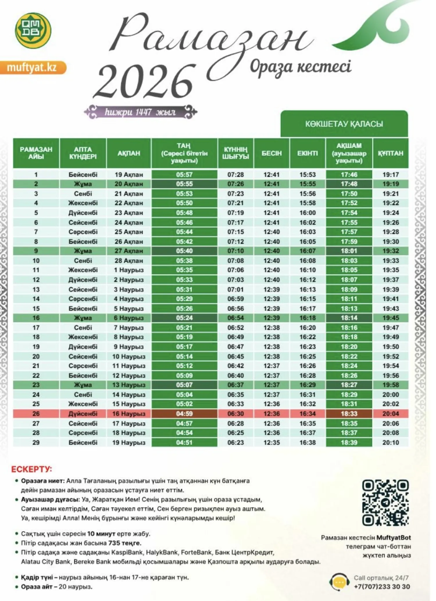 Биыл Рамазан айы 19 ақпанда басталады. Ал наурыз айының 16-сынан 17-сіне қараған түн – қасиетті Қадір түні. 20 наурыз – ораза айт мерекесі.