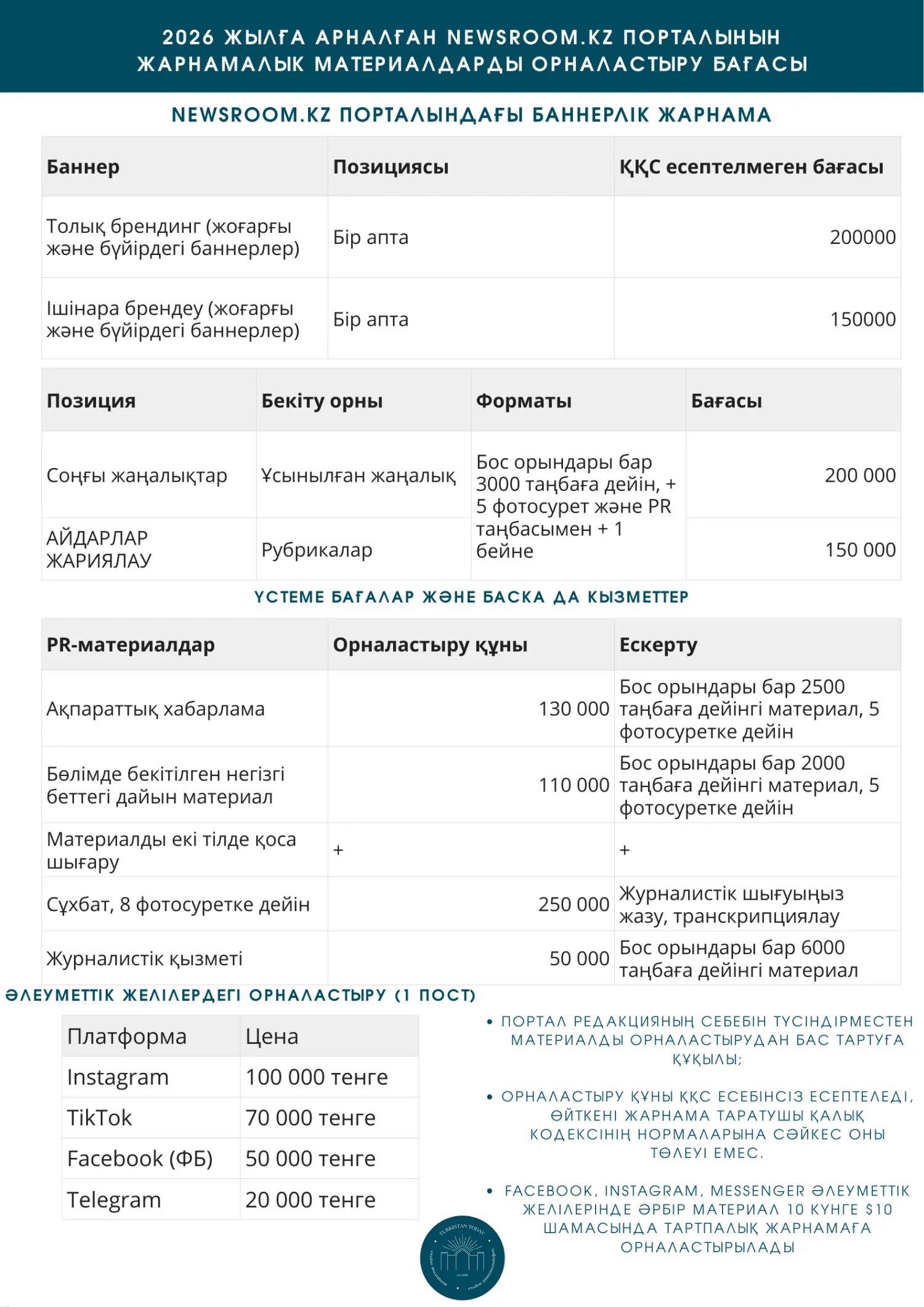 * Орналастыру құны ҚҚС (НДС) есептемегенде беріліп отыр. Себебі, жарнама таратушы ҚР Салық Кодексіне сәйкес, ҚҚС (НДС) төлеушісі емес.